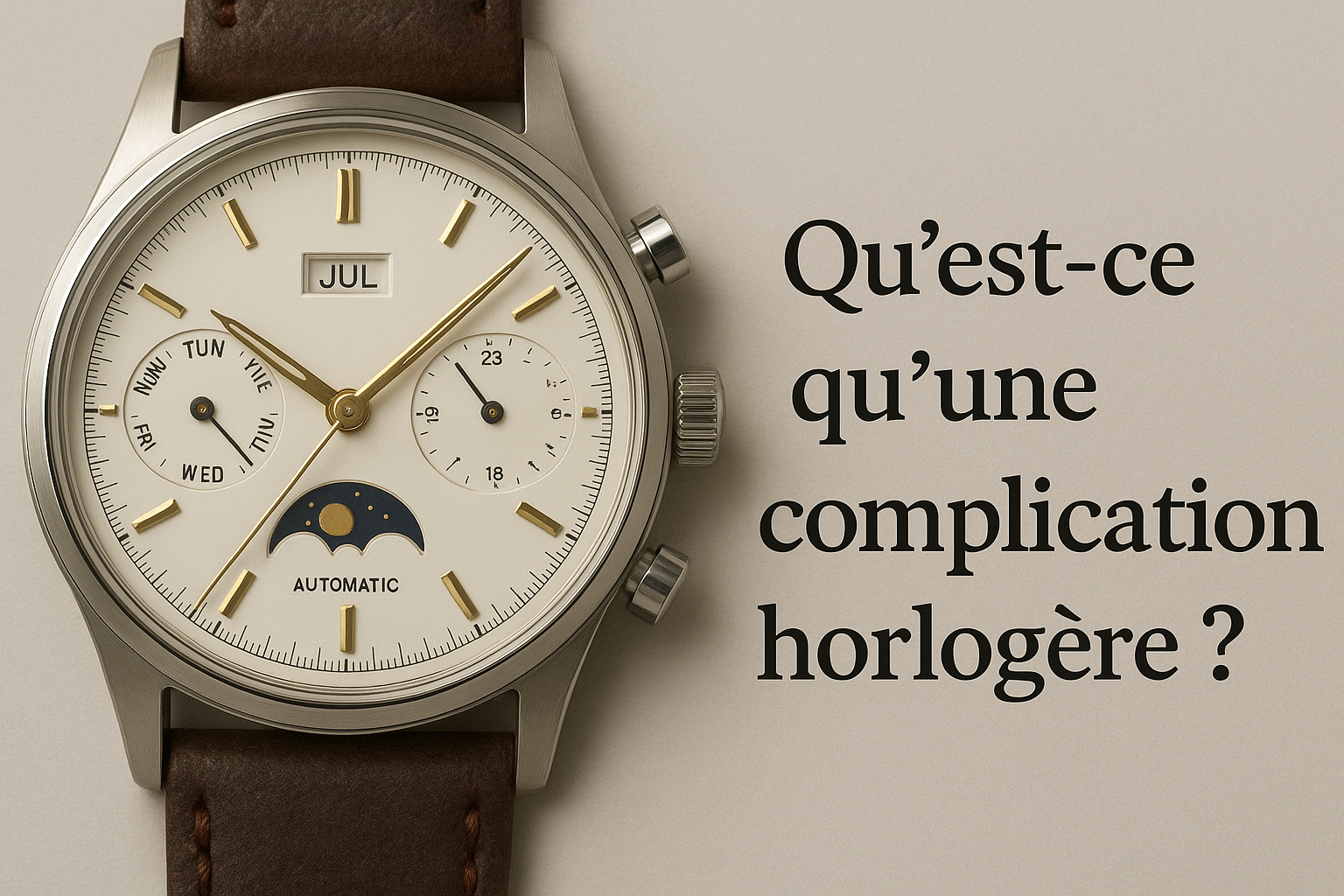 En horlogerie, une complication désigne toute fonction supplémentaire ajoutée à une montre, au-delà de l’affichage classique des heures, minutes et secondes. Ces mécanismes enrichissent l’usage ou l’esthétique du garde-temps et témoignent du savoir-faire technique des horlogers. Plus une complication est complexe, plus sa conception, son assemblage et son réglage nécessitent une grande précision. Les complications peuvent être pratiques, décoratives ou purement techniques, et elles participent à l’identité et à la valeur d’une montre.